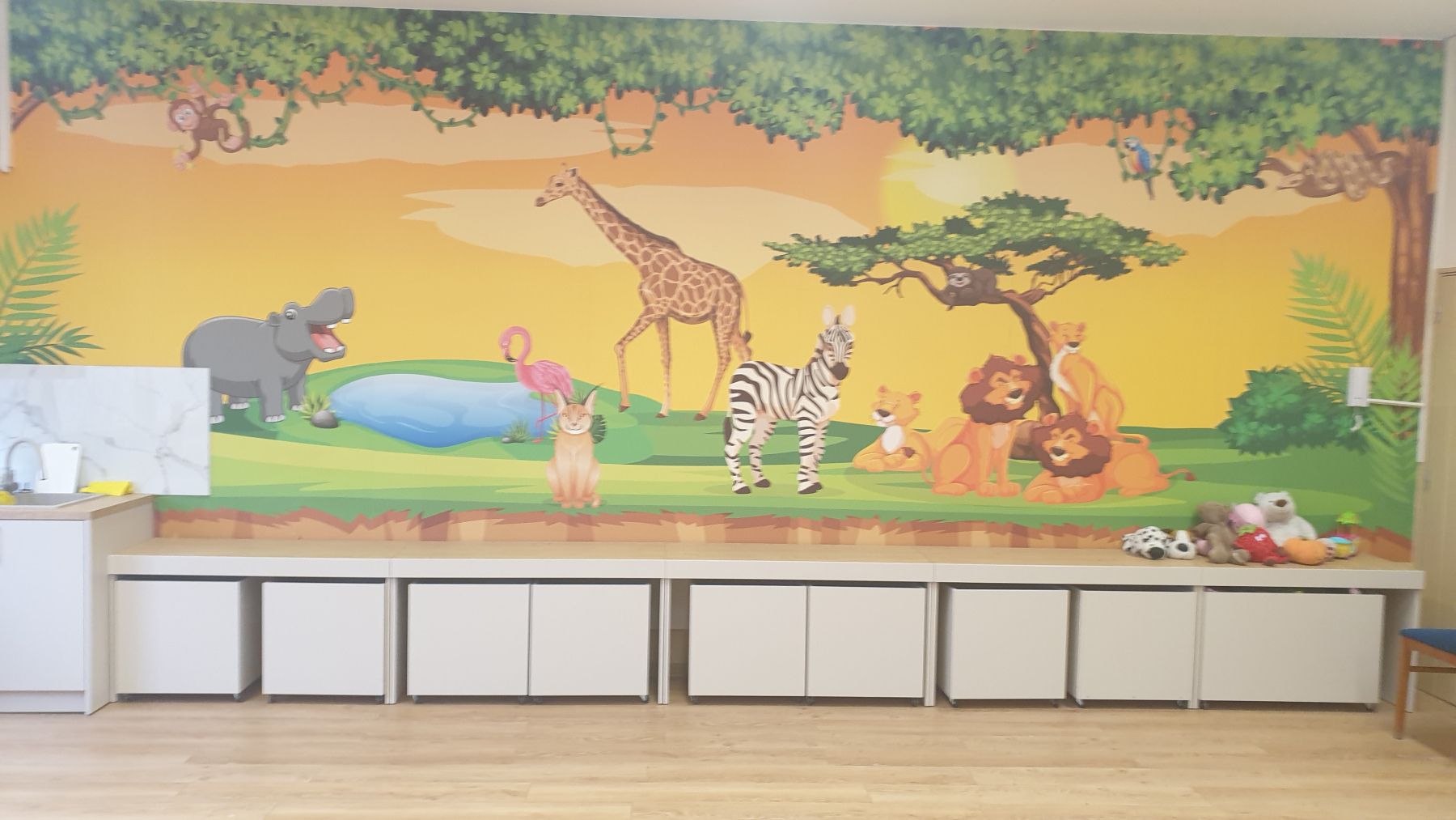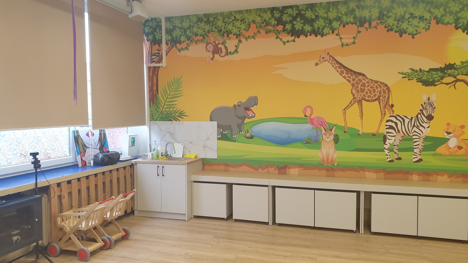 Dzięki nim sala zabaw stała się piękniejsza, większa i nowocześniejsza. Wymieniono podłogę, pomalowano ściany, a na jednej z nich znalazła się piękna kolorowa fototapeta ze zwierzętami. Zawdzięczamy to ciężkiej pracy pana Grzegorza i Krzysztofa, za co należą im się serdeczne podziękowania. W sali pojawiły się również nowe szafy, lady z kontenerami na zabawki, zlewozmywak i rolety. Dzieci są zachwycone nowym wyglądem sali. Jednym słowem rewolucja udana.